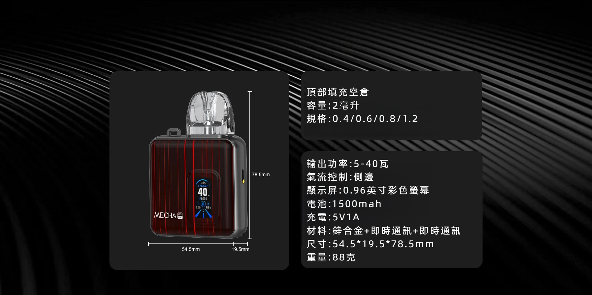 主機內建高精度恆壓晶片,吸阻穩定且每口煙量一致,不會忽大忽小。外型設計保持 Mecha 的科幻線條,但重量更輕、手感更好,適合長時間使用。專屬 Pro 卡匣提升漏油防護與霧化壽命,使用體驗更穩定安心。氣動啟動反應迅速,無需按鍵操作,新手也能立即上手。