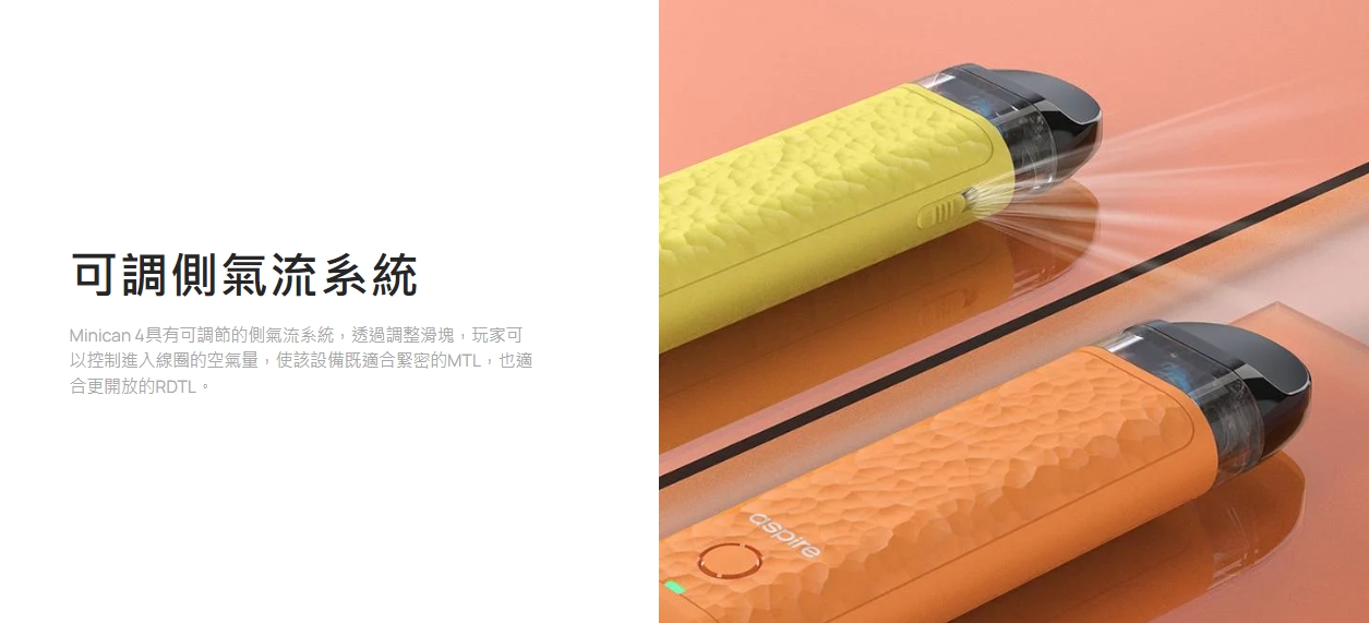 Minican 4具有可調節的側氣流系統,透過調整滑塊,玩家可以控制進入線圈的空氣量,使該設備既適合緊密的MTL,也適合更開放的RDTL。