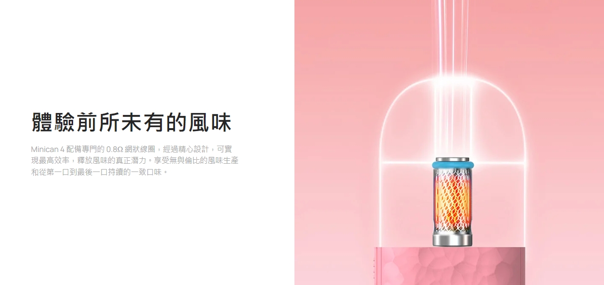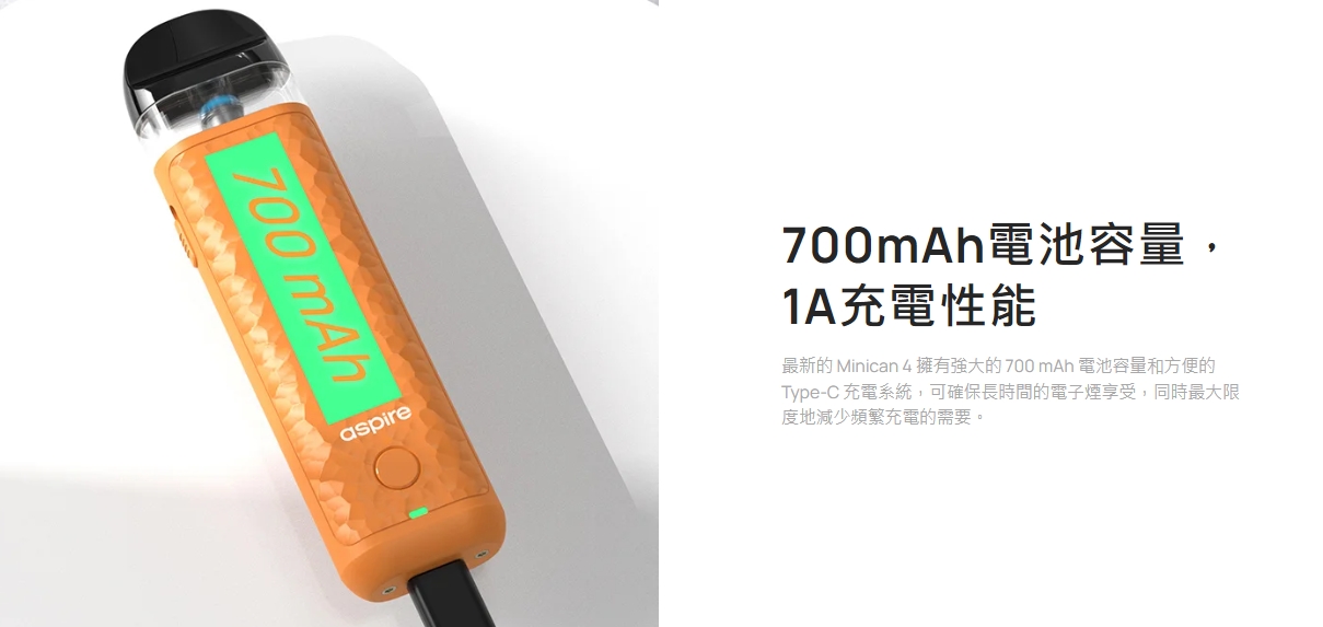 最新的Minican 4 擁有強大的700 mAh 電池容量和方便的Type-C 充電系統,可確保長時間的電子煙享受,同時盡量減少頻繁充電的需要。
