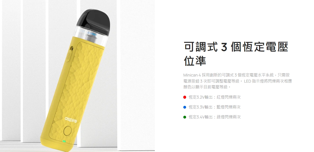 Minican 4 採用創新的可調式3 個恆定電壓水平系統,只需按電源按鈕3 次即可調整電壓等級。LED 指示燈將閃爍兩次相應顏色以顯示目前電壓等級。