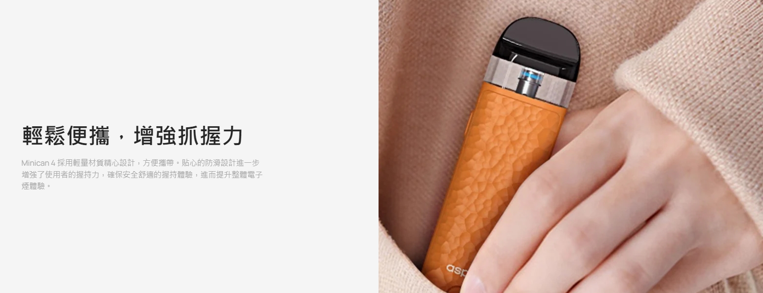 Minican 4 採用輕量材質精心設計,方便攜帶。貼心的防滑設計進一步增強了使用者的握持力,確保安全舒適的握持體驗,進而提升整體電子煙體驗。