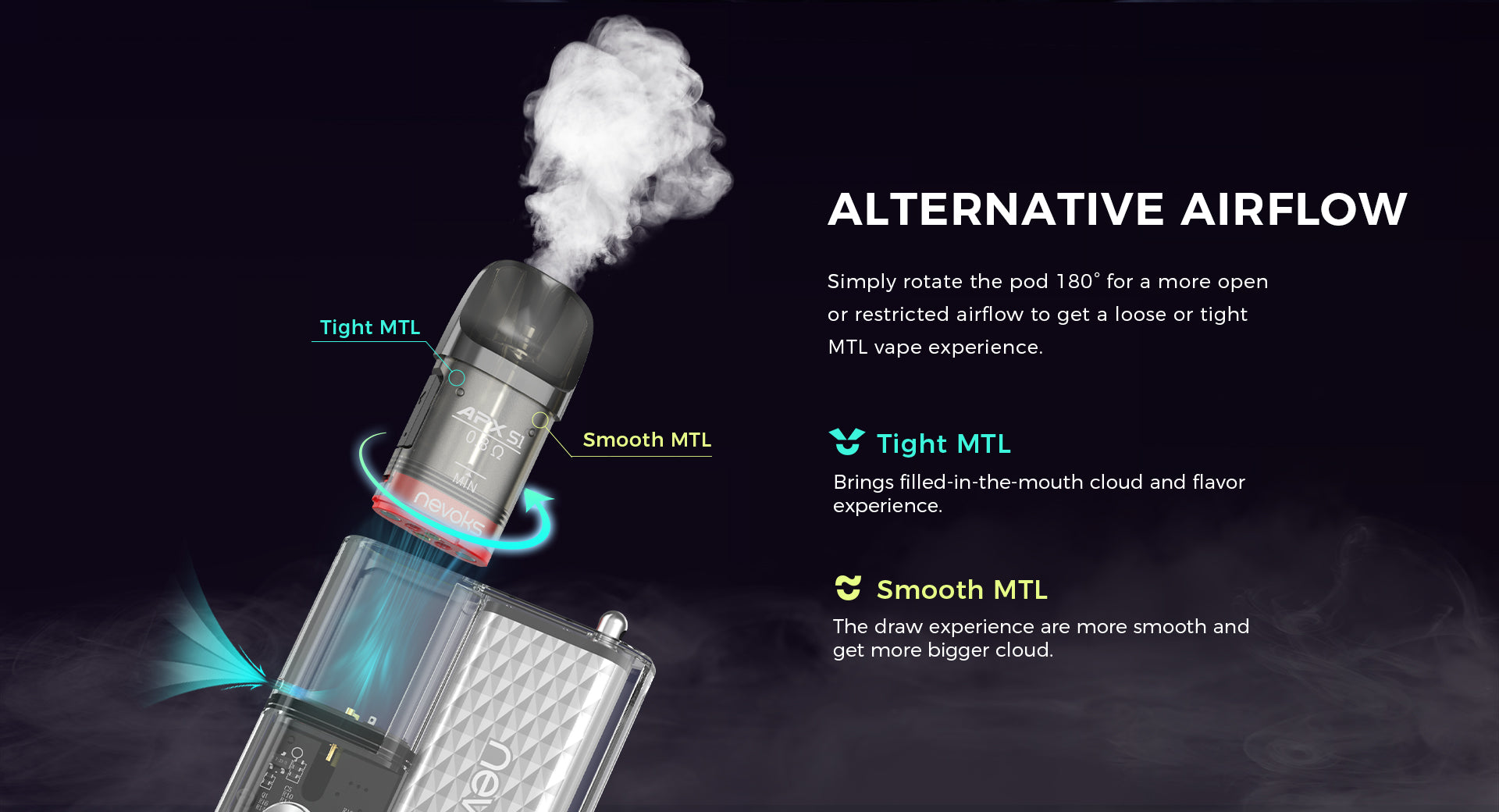 通過旋轉艙的方向,輕鬆切換緊密 MTL 和平滑 MTL 的位置,滿足不同口味需求。