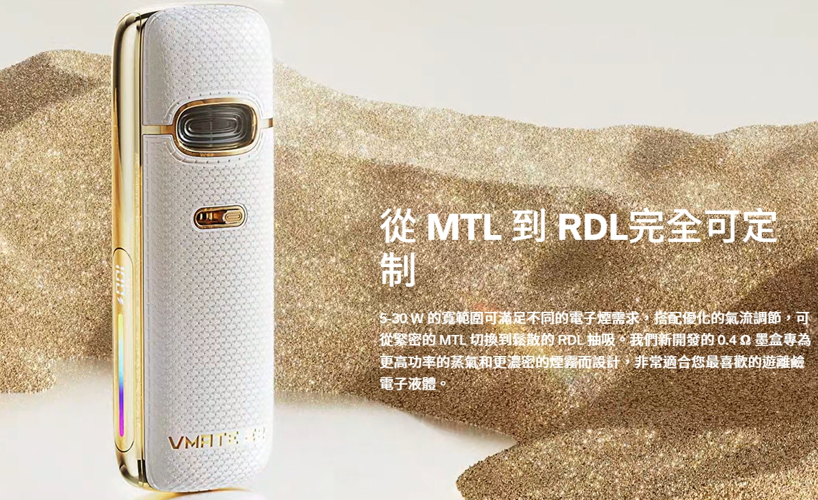 5-30W的寬範圍可滿足不同的電子煙需求,搭配優化的氣流調節,可從緊密的 MTL 切換到鬆散的 RDL 抽吸我們新開發的 0.4 Ω 墨盒專為更高功率的蒸氣和更濃密的煙霧而設計,非常適合您最喜歡的遊離鹼電子液體。