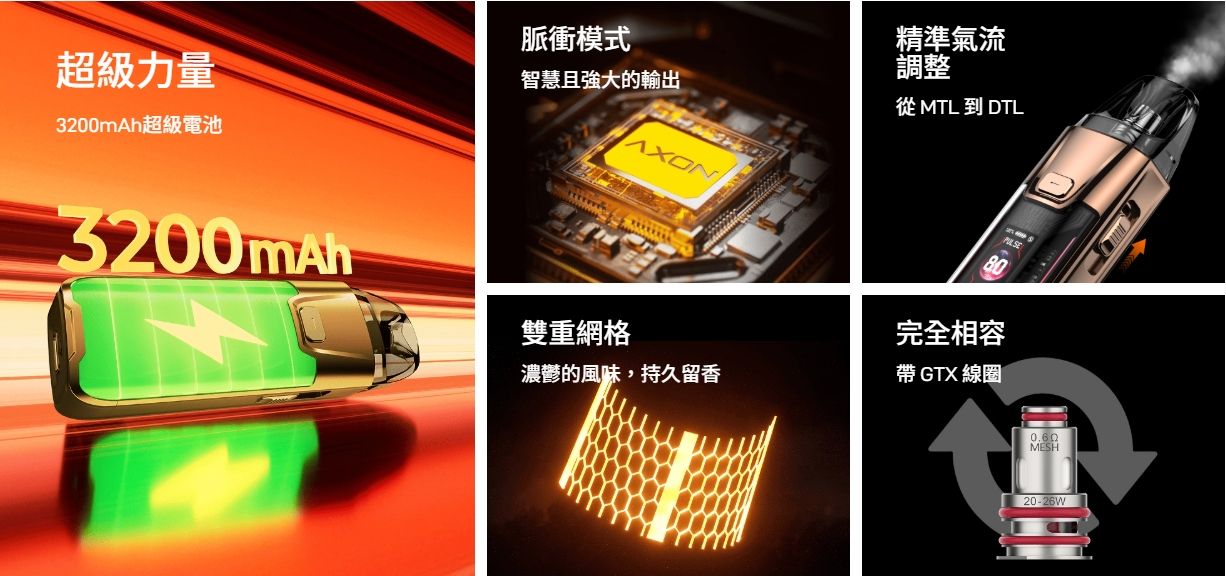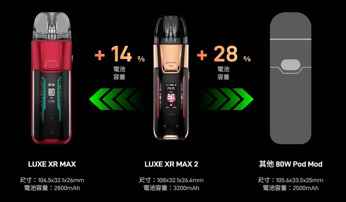 - Vaporesso LUXE XR Max 2 大煙主機搭載 2800mAh 電池與最高 80W 大功率,支援 GTX Mesh 線圈與 RDL/DTL 雙吸模式,AXON 智能晶片加持,透明機身時尚高顏值,適合追求性能與外觀的進階玩家,台灣現貨供應!