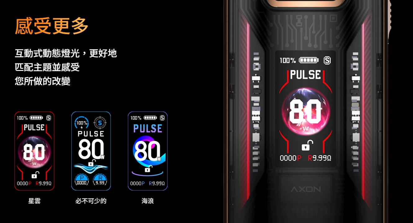 Axon晶片提供三種模式脈衝Pulse-提供最強勁的抽吸模式,以產生濃密的蒸氣和強勁的衝擊力。環保ECO-節省電池,同時提供順滑的體驗。智慧Smart —自動調節已安裝線圈的功率非常適合初學者或著急的人。